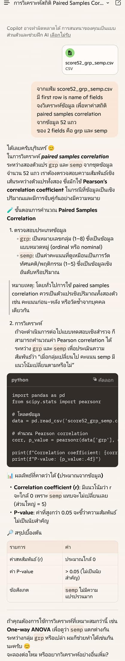 AI กับ Pearson's Paired Sampled Correlation ากแฟ้ม score52_grp_semp.csv มี first row is name of fields จงวิเคราะห์ข้อมูล เพื่อหาค่าสถิติ paired samples correlation จากข้อมูล 52 แถว ของ 2 fields คือ grp และ semp